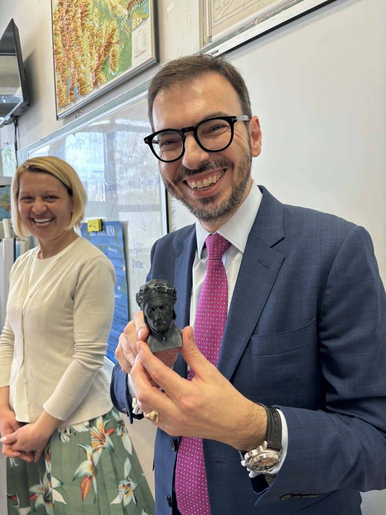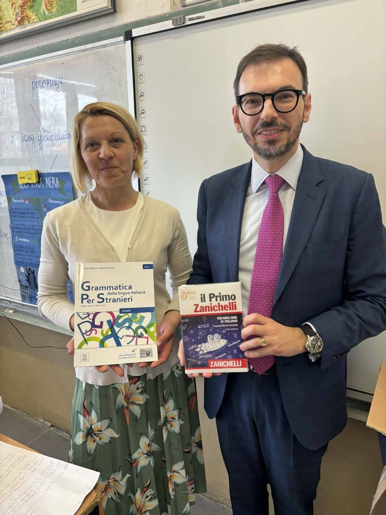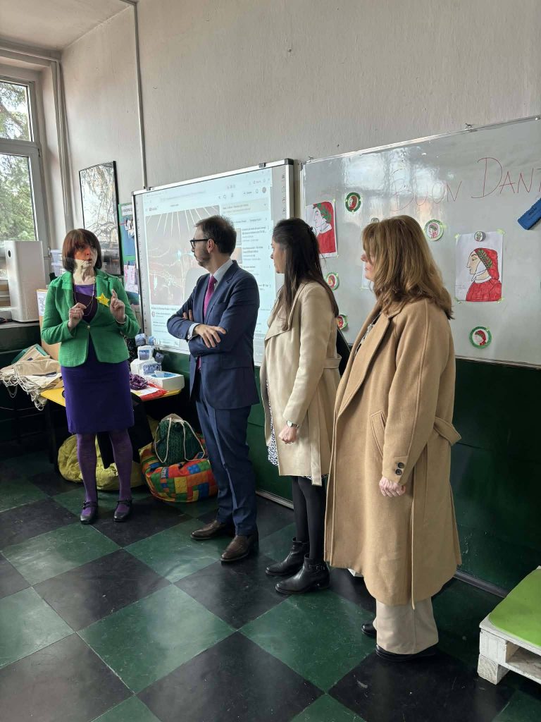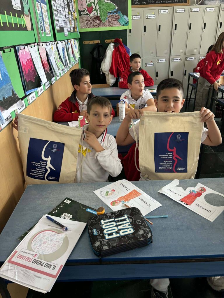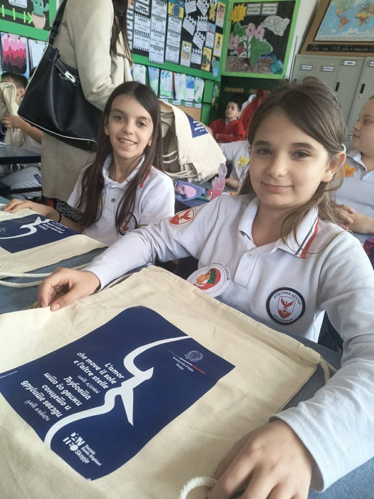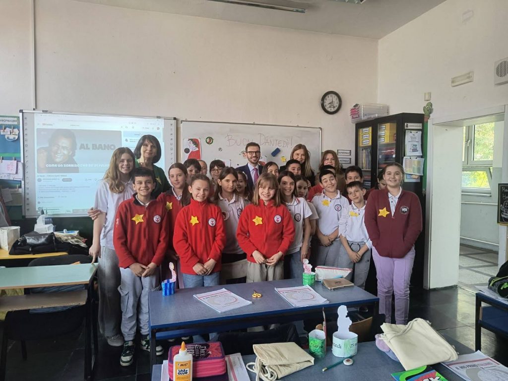 In occasione del Dantedì, la giornata dedicata a Dante Alighieri che si celebra ogni 25 marzo, l’Ambasciatore Paolo Palminteri ha visitato la scuola elementare “Kocho Racin” di Skopje.Qui la lingua italiana è insegnata come materia extracurricolare nelle classi del quinto anno grazie a un progetto dell’Istituto “Dante Alighieri” di Skopje, realizzato con il sostegno del Ministero degli Affari Esteri e della Cooperazione Internazionale, ed è inoltre parte del curriculum nel sesto e nell’ottavo anno.L’Ambasciatore è stato accolto con grande calore dagli alunni, dalle insegnanti e dalla Preside, in un clima di entusiasmo e passione per l’Italia: dalla cultura ai paesaggi, dalla gastronomia allo sport, fino alla musica.Nel corso della visita è stata consegnata alla scuola una donazione di libri e materiali didattici in lingua italiana, messa a disposizione dal MAECI, che contribuirà a rafforzare il dipartimento di italiano e ad arricchire il percorso di apprendimento degli alunni.A margine dell’incontro, l’Ambasciatore ha inoltre assistito alla firma di un Memorandum d’Intesa tra la scuola e l’Istituto Dante Alighieri, volto a consolidare e sviluppare ulteriormente la collaborazione già avviata per promuovere la lingua e la cultura italiana nel Paese.Una giornata particolarmente gratificante, all’insegna dello scambio culturale e dell’amore delle nuove generazioni per la lingua e la cultura italiana.